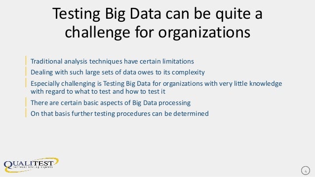 After the data has been cleaned, several tests must be conducted. Testing Big Data can be very challenging for organizations, especially if they aren’t privy to various testing techniques. However, there are certain basic aspects of data processing that every organization should be able to learn and conduct.